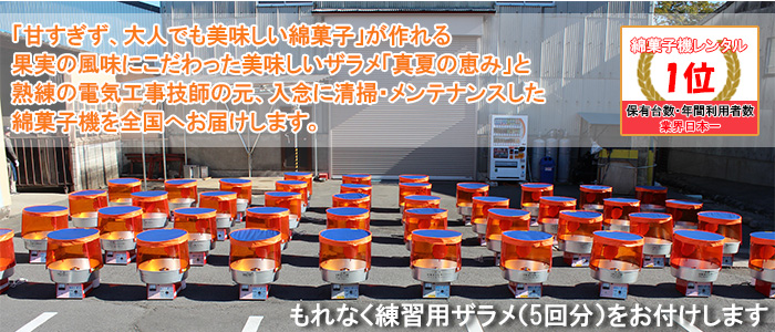 甘味だけでなく、酸味、旨みにこだわった綿菓子のザラメ「真夏の恵み」を販売して、誰でも簡単に綿菓子のイベントが出来るように、全国に綿菓子機をレンタルしています。